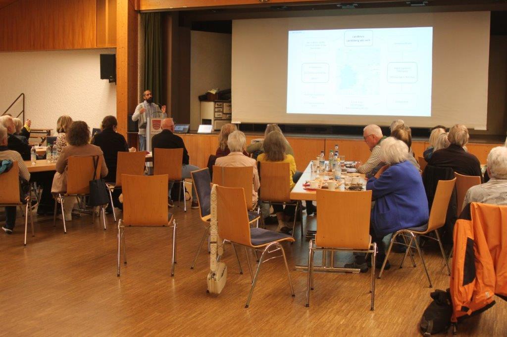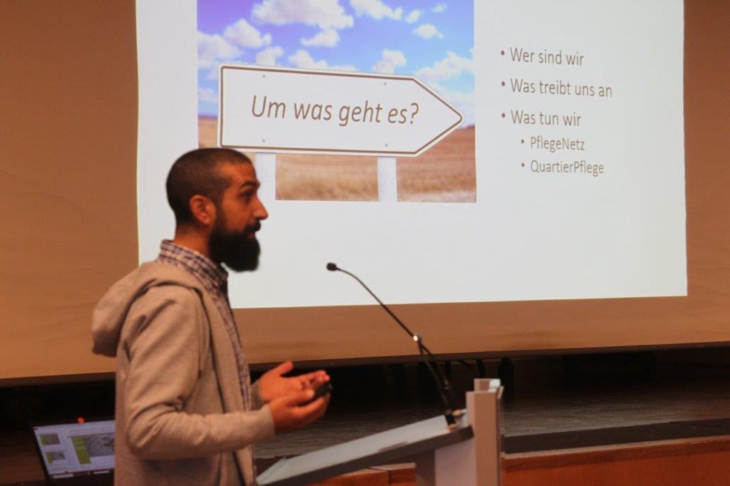 Der Referent Pajam Rais Parsi vom Landratsamt Landsberg führte aus, dass der Mangel an Pflegekräften nicht mit den bisherigen Konzepten zu beheben sei. 2029 werde die Zahl der Pflegefachkräfte, die in Rente geht, die Zahl der Nachrücker übersteigen. Der größte Pflegedienst der Nation, die Pflege zu Hause, werde aus vielfältigen Gründen auch immer weiter schrumpfen. Deshalb baue der Landkreis Landsberg ein Pflegenetz auf, in dem die Sorgenden Gemeinschaften eine wichtige Rolle spielen. Menschen im kleinräumigen Quartier werden gegen Bezahlung und nach entsprechenden Schulungen Unterstützungsleistungen erbringen. Um diese abrechnen zu können gründet der Landkreis einen eigenen Pflegedienst.