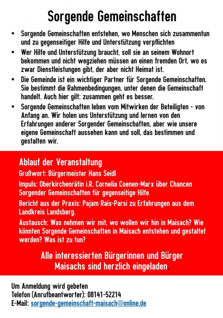 Eine durchwegs positive Bilanz zog am Ende Hartmut Hombach: „Die beiden Referenten haben es geschafft, den Anwesenden zu vermitteln, wie Sorgende Gemeinschaften entstehen und funktionieren können und sie haben Lust darauf gemacht, sich weiter mit dem Thema zu beschäftigten.“ Die nächste Aufgabe sei es, eine Strategie zu entwickeln, wie Sorgenden Gemeinschaften in Maisach entstehen können“.