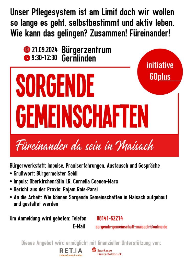 Die inititiative60plus e.V. Maisach hatet am Samstag, 21.09.2024 zu der Veranstaltung „Sorgende Gemeinschaften – Füreinander da sein in Maisach“ in das Bürgerzentrum in Gernlinden eingeladen. Über siebzig Teilnehmerinnen und Teilnehmer, unter ihnen auch einige Gemeinderäte, folgten dieser Einladung. „Das ist ein großer Erfolg,“ sagte Hartmut Hombach, Gemeinderat und Initiator von 60plus, „denn mit so viel Interesse haben wir nicht gerechnet.“